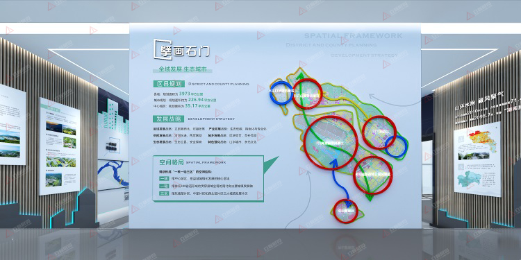 石門縣宛如一顆綠色的寶石鑲嵌在湖南北部,東南毗連八百里洞庭湖,西接武陵山脈,和國家森林公園張家界為鄰,雄居縣境北部的壺瓶山與湖北神農(nóng)架互為依托,享有“武陵門戶”與“瀟湘北極”之稱的美譽(yù)。我司以印象石門、擘畫石門、筑夢(mèng)石門為三大主題,通過規(guī)劃展示廳這一窗口,讓訪客了解發(fā)現(xiàn)石門萬象。展示廳貫穿石門的山、水、城、文等宜游宜居城市特質(zhì)元素,浸透著“澧濱晨曦,山水石門”的氣質(zhì)。